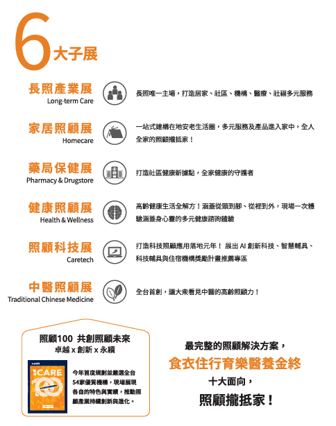 今年規劃的6大子展包括長照產業展、家居照顧展、藥局保健展、中醫照顧展、健康照顧展與照顧科技展;12大主題館進一步凸顯多元議題,包含高齡友善住宅館、友鄰居主題館、進食照顧區、寵物長照館、樂齡玩具館、創齡藝術館、台日高齡產業創新育成館、醫照整合區、ACAH在宅急症照護館、失智幸福館、癌症照顧館與安寧善終區。全面涵蓋食、衣、住、行、育、樂、醫、養、金、終等十大面向,呈現最完整的照顧解決方案,也成為產業跨界合作的最佳舞台。