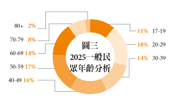 回顧2025年台北國際照顧博覽會,展會規模與影響力已展現成熟平台的樣貌。2025年共集結450家參展商(參展類型如圖二)、800個攤位,吸引19,986位參觀者、超過5萬人次進場(如圖一),成為全台最大、最具代表性的照顧產業交流場域。特別的是,參觀者結構正顯著改變:一般民眾佔比達45%,其中40至59歲的「熟齡族群」佔33%,顯示照顧議題已從專業領域延伸至家庭核心(如圖三)。