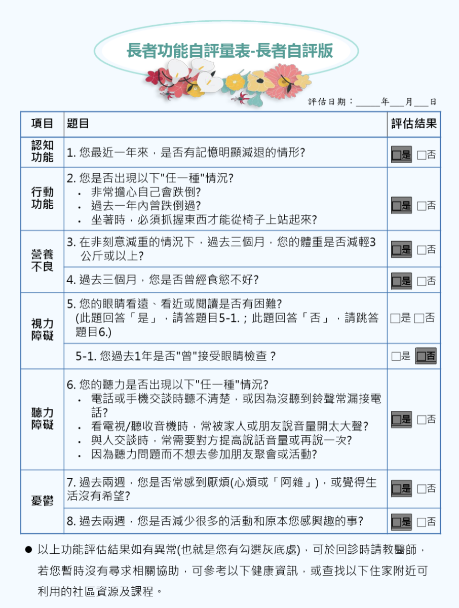 長輩可以運用自我評估量表,判斷是否可能已有跌倒風險。(圖片來源/國健署)