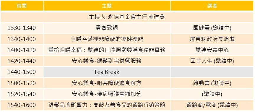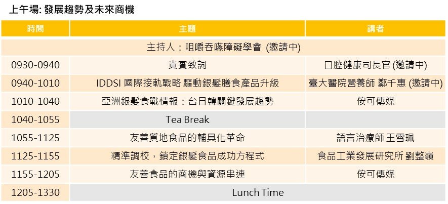 協辦單位 │ 中華民國牙體技術師公會全國聯合會、中華民國語言治療師公會全聯會、中華民國學名藥協會、中華民國營養師公會全國聯合會、台灣生技產業聯盟、台灣咀嚼吞嚥障礙醫學學會、台灣居家服務策略聯盟、台灣長期照顧發展協會全聯會、台灣保健營養食品工業同業公會、台灣銀髮產業協會、質地友善食品產業聯盟、食品工業發展研究所、新北市糕餅商業同業公會、台灣由口進食協會 (邀請中)
