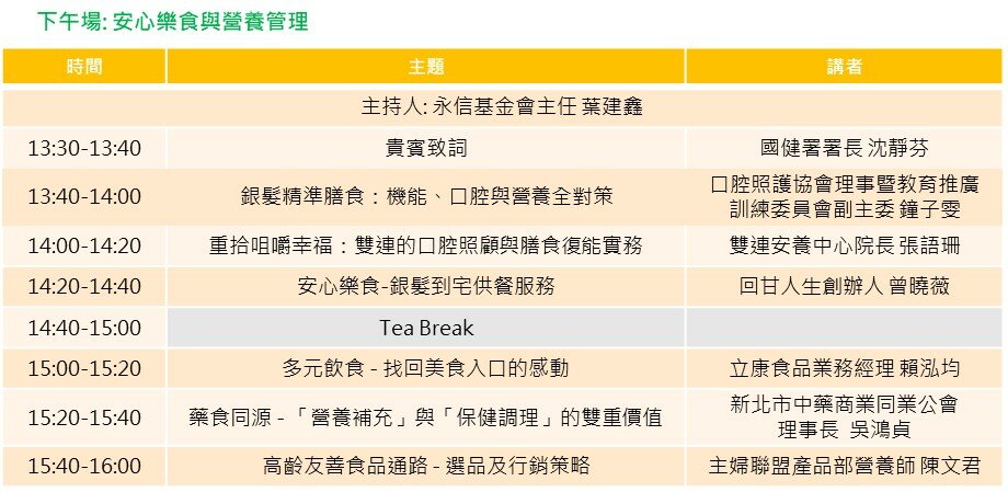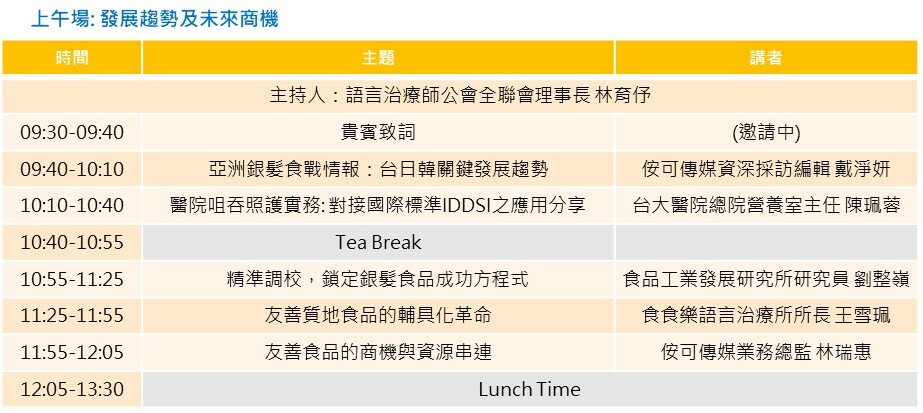 協辦單位 │ 中華民國牙體技術師公會全國聯合會、中華民國語言治療師公會全聯會、中華民國學名藥協會、中華民國營養師公會全國聯合會、台北市社區銀髮族長期照顧發展協會、台灣生技產業聯盟、台灣由口進食協會、台灣咀嚼吞嚥障礙醫學學會、台灣居家服務策略聯盟、台灣長期照顧發展協會全聯會、台灣長照社團法人協會、台灣保健營養食品工業同業公會、台灣銀髮產業協會、食品工業發展研究所、桃園市長期照護體系協會、新北市長期照護發展協會、新北市糕餅商業同業公會、臺灣護理之家協會、質地友善食品產業聯盟 (TAF)
