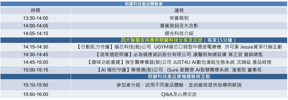 為了降低照護人員負擔,提升照護服務水準,本次研習會特地邀請到福芯科技(股)、必為健康資訊(股) 、強生醫療儀器(股)、聯億通(股)等不同面相之業者齊聚一堂,將帶您深入探討四大智慧支持應用方案,活動中除了介紹如何運用最新的 AI 智慧、感測技術與遊戲化系統,為不同需求的長輩量身打造一套「科技防護網」,同時與會者也可透過此活動了解並親自體驗科技產品,加速科技產品於照護領域的普及和應用。