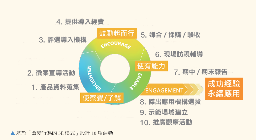 計畫執行3年已輔導全台29家機構成功導入智慧照顧產品/服務,包括8家離島偏鄉機構。推動智慧科技應用於高齡照顧一項重要的挑戰,是改變照顧者的行為模式;基於「改變行為的3E模式」設計10項活動(如圖),期望建立推動智慧科技應用於高齡照顧典範模式。