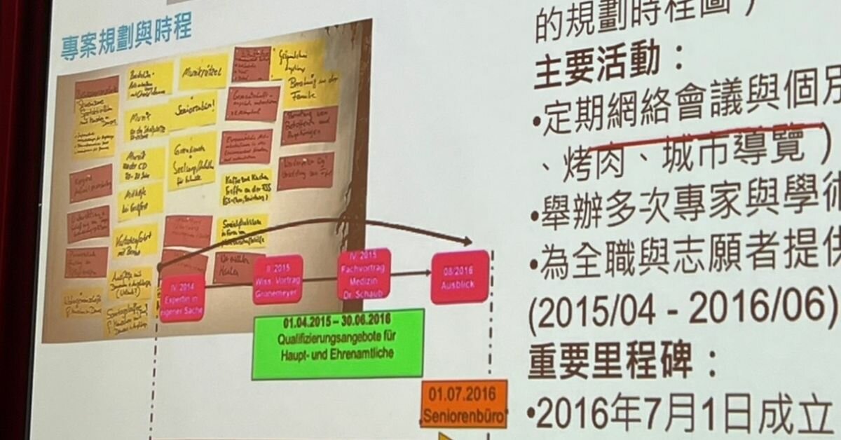 約翰尼斯秀出一片貼滿便利貼的牆面,在貝吉格鎮,每一場活動都是由地區共同提出,從2014年9月至2016年8月規畫期間,舉辦了定期的網絡會議、個別活動,包含馬車遊、郊遊、烤肉、城市導覽,以及多次的失智相關專家學術論壇,並成立了「長者服務辦公室」。
