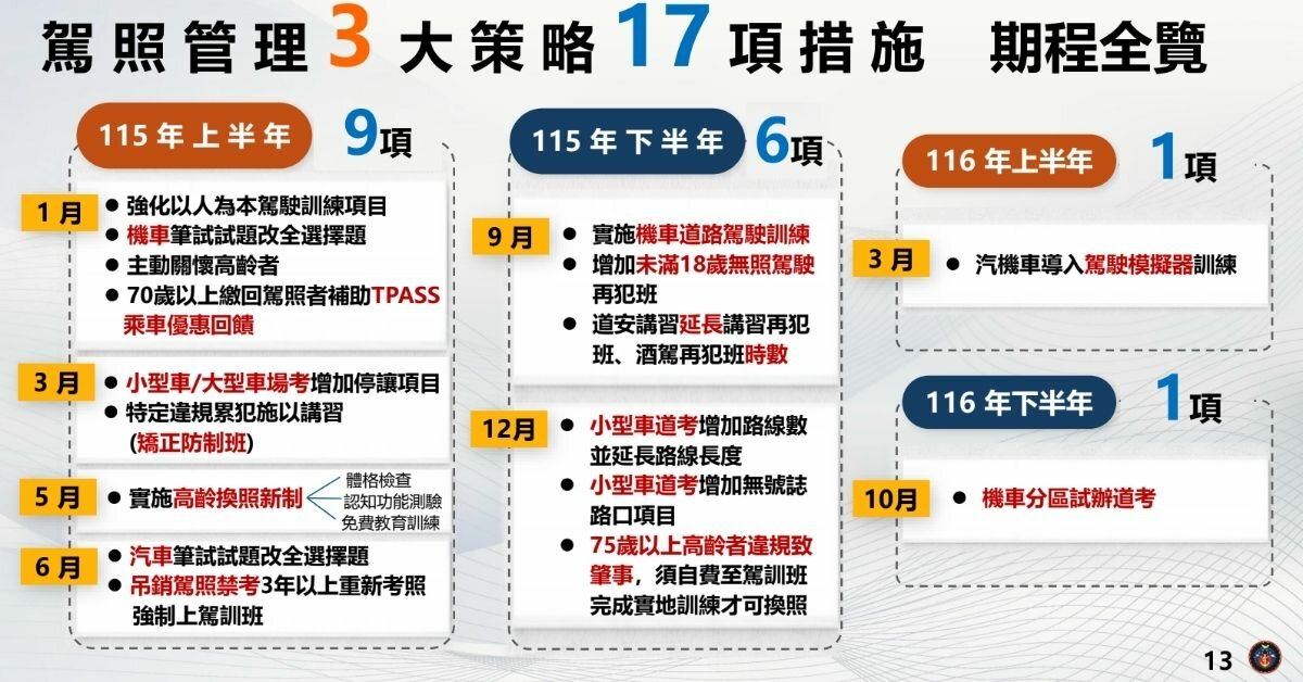 高齡駕駛分級關懷從2026年1月開始,主動通知關懷常見違規矯正、主動繳回駕照補助乘車優惠回饋(含計程車);2026年5月換照關懷新制,從70歲一換到75歲,75歲維持3年一換。2026年5月也將開啟免費安全教育課程,提供最新交通安全法規知識、危險感知體驗;2026年12月起,75歲以上違規致肇事者自費至駕訓班實地訓練,同時也實施新式體檢,納入醫生評估靈活度機制。