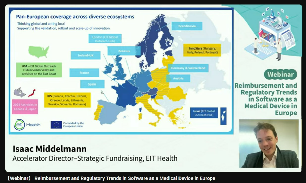 EIT Health法規與市場策略顧問Isaac Middelman分析歐洲醫材軟體產業在臨床應用與保險報銷上的挑戰。他指出,許多醫療專業人員對數位醫療解決方案缺乏信任與操作熟悉度並仍存有疑慮,造成SaMD產品的臨床推廣受限。另一方面,企業可能難以明確量化產品的臨床與經濟效益,故仍可能遭保險機構拒絕報銷。
