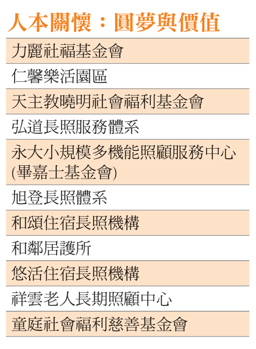 侒可傳媒邀請54家卓越機構(見表)共同催生這本《照顧100》專刊,其意旨並非挑選100家的機構,而是象徵「照顧百分百」的滿分照顧,建立大眾對照顧產業的認同,提升產業形象與專業自信,同時鼓勵照顧機構追求100分的卓越表現,也是全方位的照顧支持。