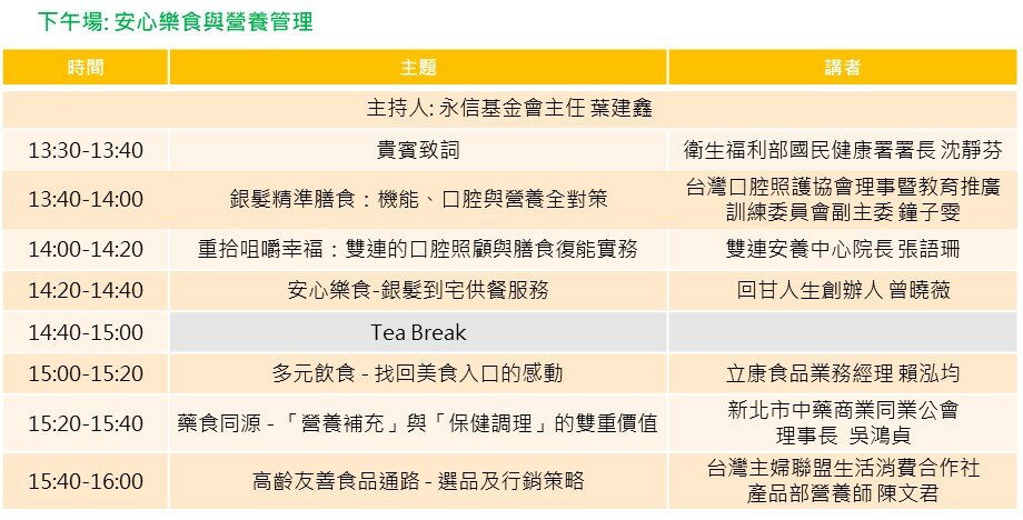 協辦單位 │ 中華民國牙體技術師公會全國聯合會、中華民國語言治療師公會全聯會、中華民國營養師公會全國聯合會、台北市社區銀髮族長期照顧發展協會、台灣口腔照護協會理事暨教育推廣訓練委員會、台灣生技產業聯盟、台灣咀嚼吞嚥障礙醫學學會、台灣居家服務策略聯盟、台灣長期照顧發展協會全聯會、台灣長照社團法人協會、台灣保健營養食品工業同業公會、台灣銀髮產業協會、永信社會福利基金會、食品工業發展研究所、桃園市長期照護體系協會、新北市長期照護發展協會、新北市糕餅商業同業公會、臺灣護理之家協會、質地友善食品產業聯盟 (TAF)